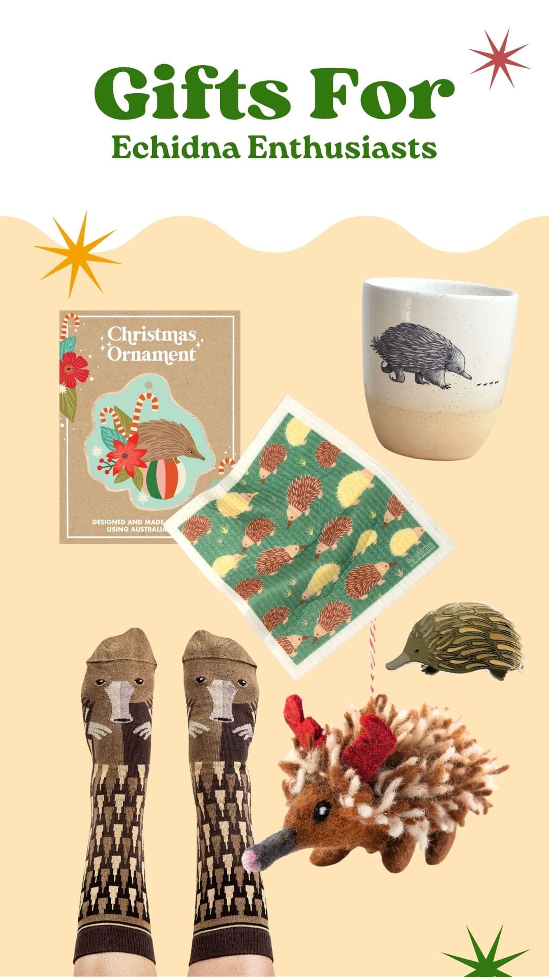 Top favourites include enamel pins, printed socks, Swedish dish cloths, ceramic mugs, ornaments, greeting cards, and festive decorations — each celebrating the iconic Australian echidna and crafted by independent makers.