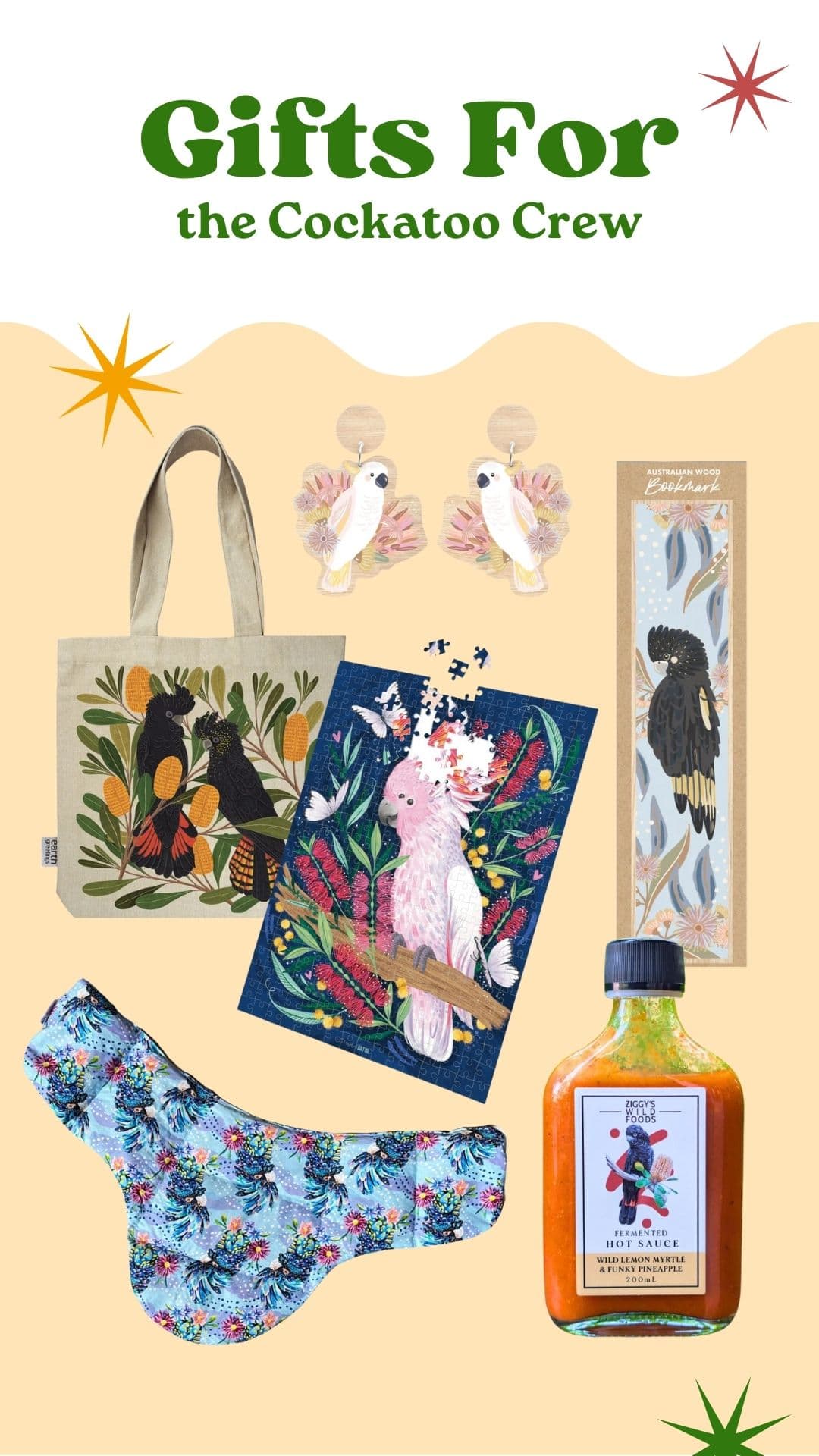 Great options include a detailed wooden jigsaw puzzle, vibrant socks with cockatoo prints, earrings, tea towels, tote bags, greeting cards, and decorative ornaments.