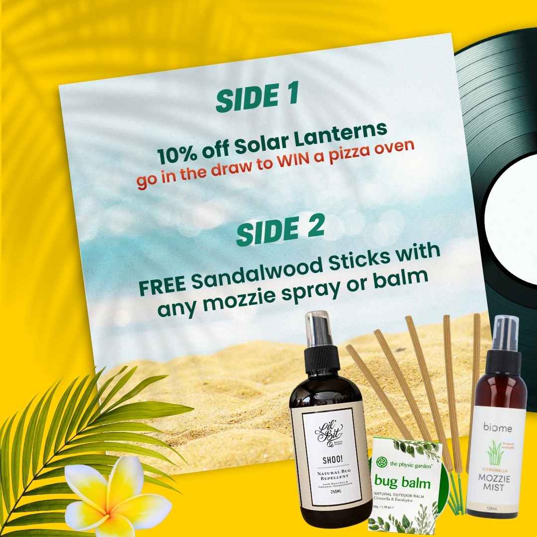 • Five free sandalwood sticks with any bug spray or balm (one per customer).