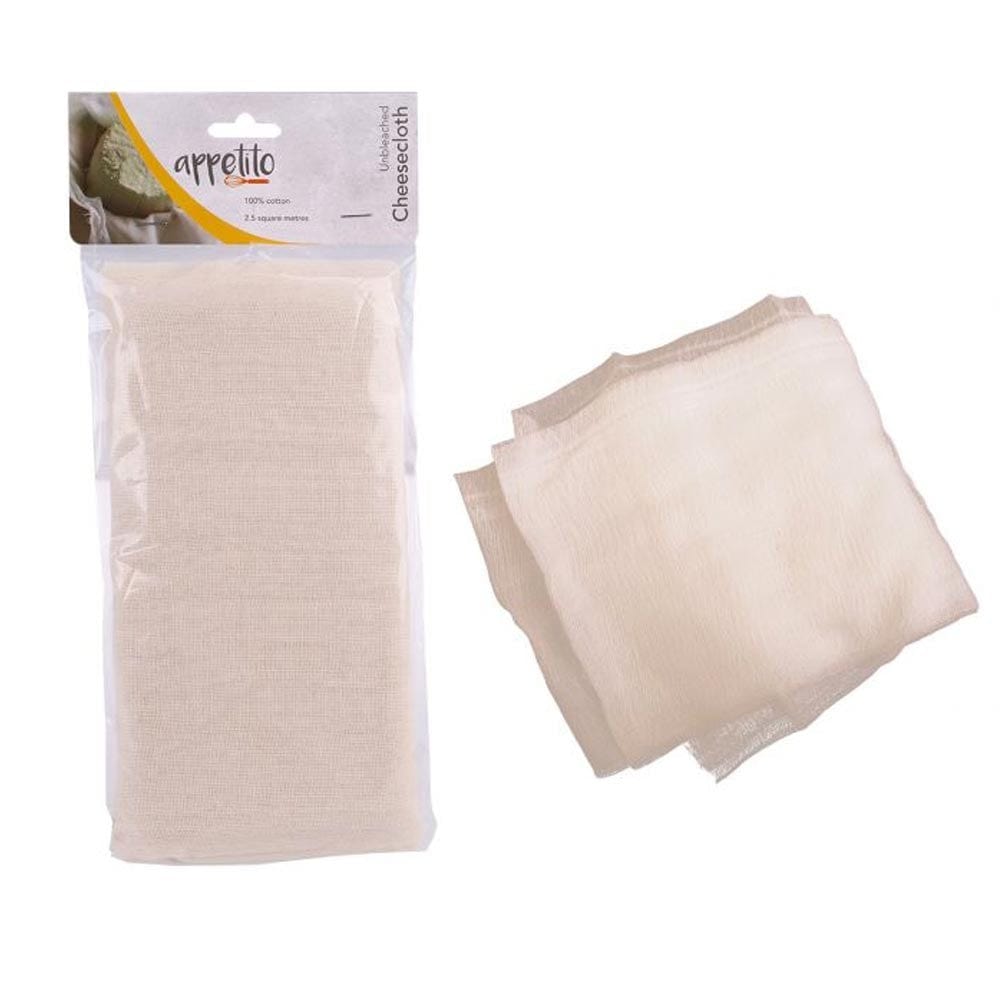 Appetito Unbleached Cheesecloth - 2.5 Square Metres. Cheesecloth has infinite uses in the kitchen and beyond! Perfect for cheesemaking, cooking, baking, straining, bundling herbs, covering food, cleaning and so much more. Made from 100% unbleached cotton.