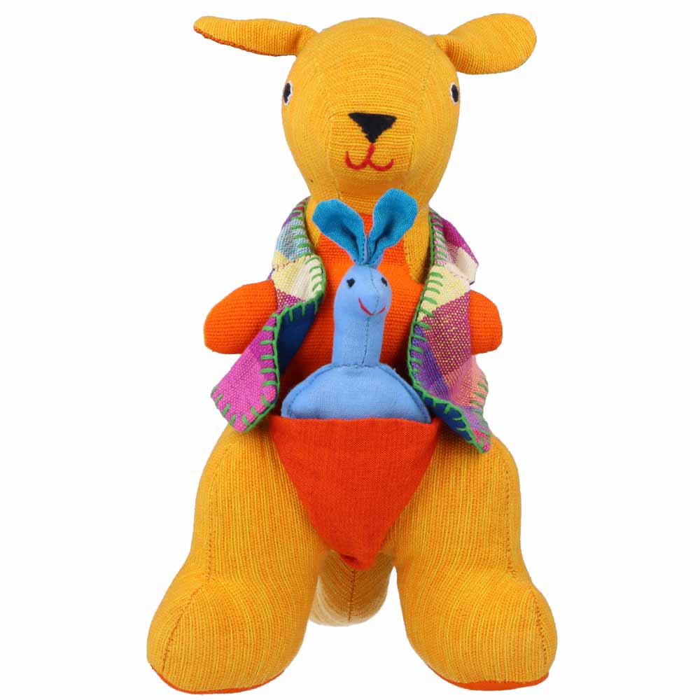 Australian Barefoot kangaroo. This smiling kangaroo stands at 28cm and has a beautiful joey in her pouch. Her vibrant colours make her a captivating children's toy. Made in Sri Lanka by Barfefoot Artisans. Colours are selected at random.
