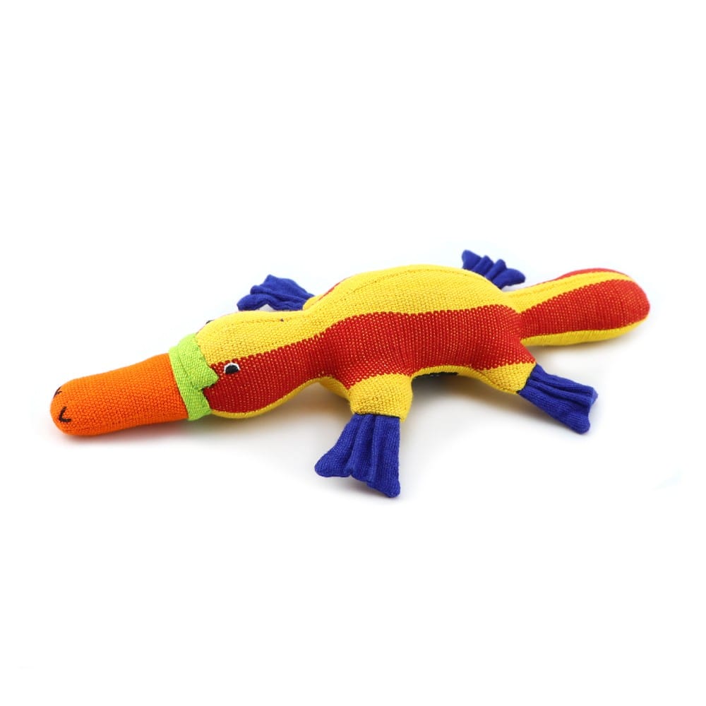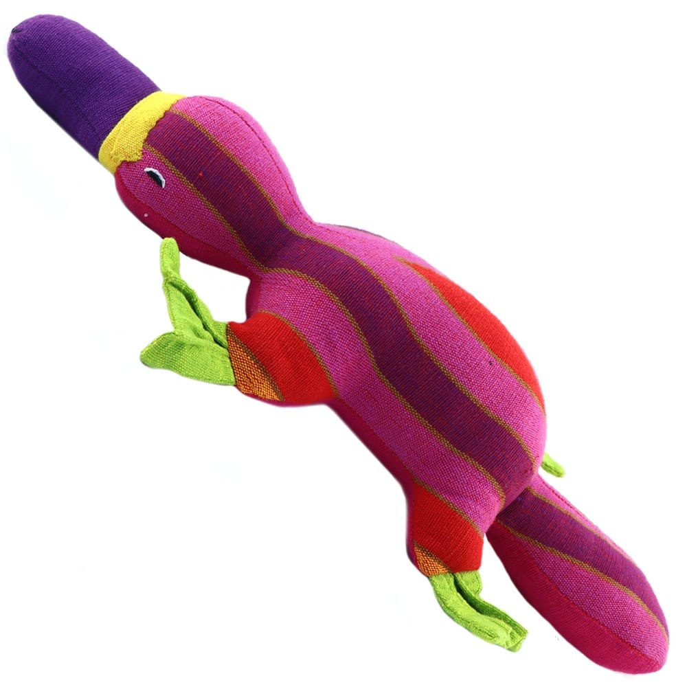 Australian Barefoot Toys - Platypus. A Barbara Sansoni soft toy platypus, handmade from beautiful hand spun and woven cotton fabric. Joyfully multicoloured in its design and made to last a lifetime. Colours and print combinations can vary and your toy might be slightly different to the one pictured. Colours selected at random.