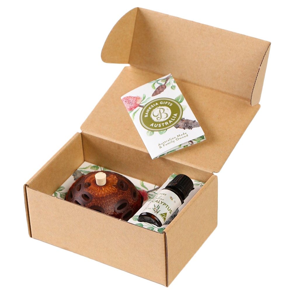 Banksia Aroma Pod Mini Gift Pack. Gift Australia's best natural diffuser, with this aroma pod and essential oil gift box. Featuring a mini Banksia pod, drilled to diffuse oils naturally and a native Eucalyptus essential oil (10ml). Use at the bedside, in the car, in the bathroom, kitchen or wardrobe. No flames, electricity or water required. Packaged in a beautiful gift box.