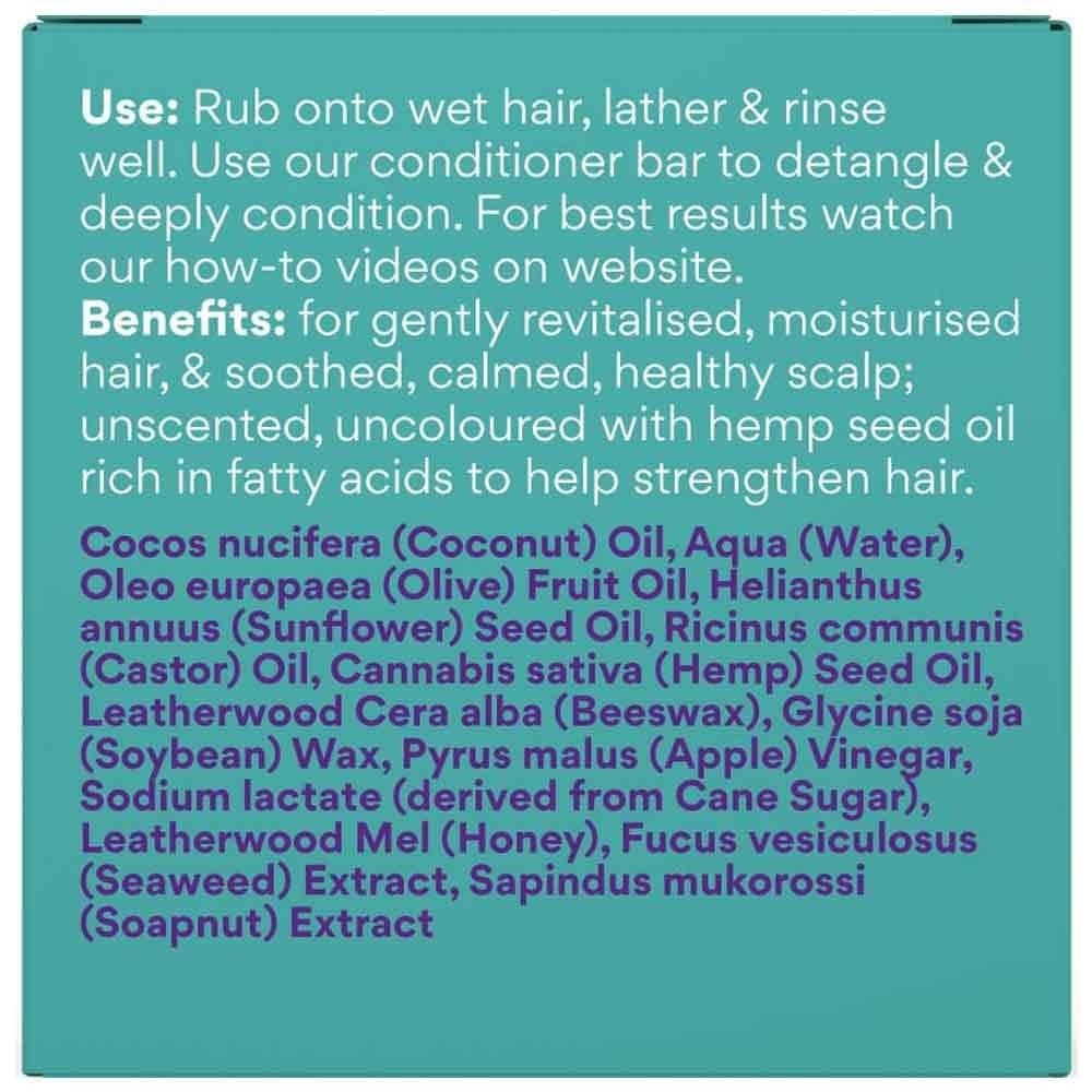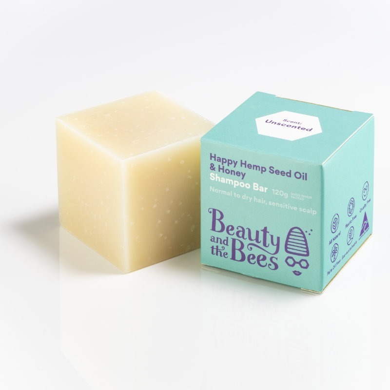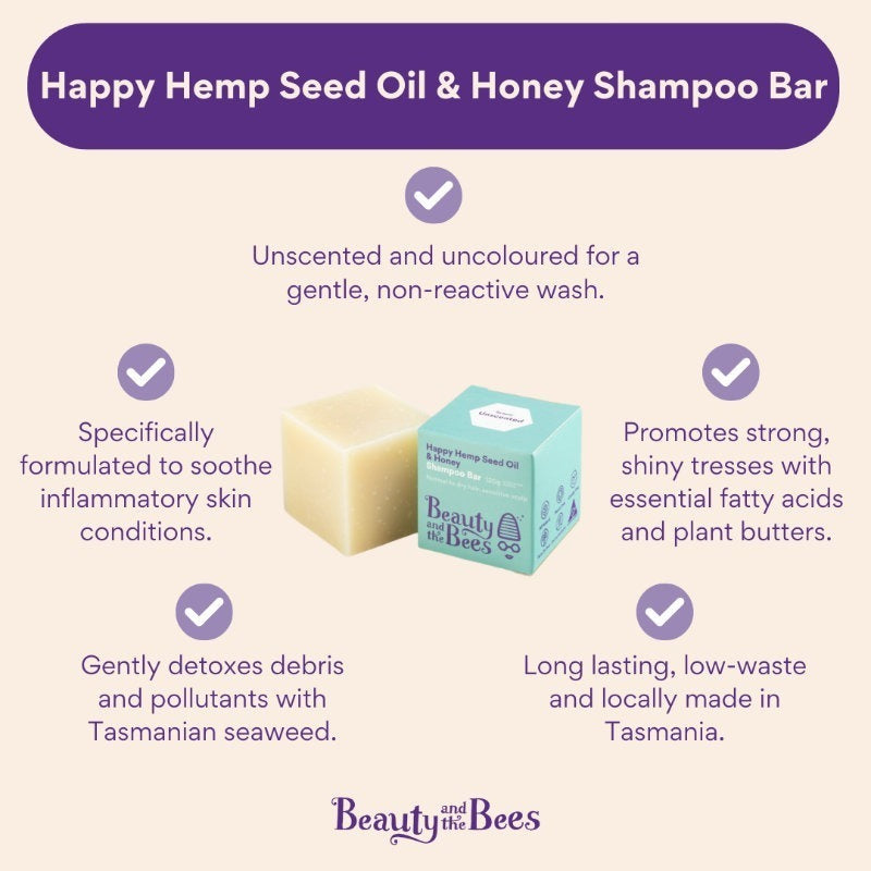This Hemp & Honey shampoo bar by Beauty & the Bees is unscented and uncoloured for a gentle, non-reactive wash. Specifically formulated to soothe inflammatory skin conditions, it promotes strong, shiny hair with essential fatty acids and plant butters. A handmade chemical-free solid shampoo bar, rich in plant and nut oils and herbs. Net weight when packed 120g. Hand cut bar.