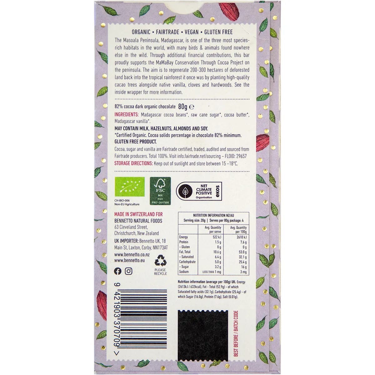 Indulge in pure Madagascan dark chocolate with 82% cocoa with the Bennetto Organic Dark Chocolate 80g - Super Dark. This vegan, organic and fair trade chocolate bar is committed to preserving the environment, and tastes great. 80g.