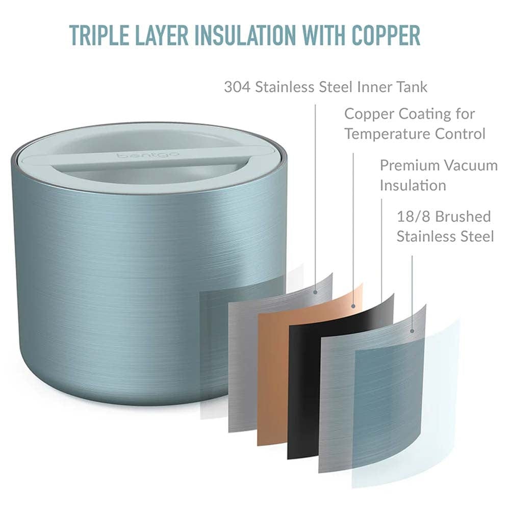 • Double walled stainless steel and triple layer insulation with copper keeps meals cold or warm.