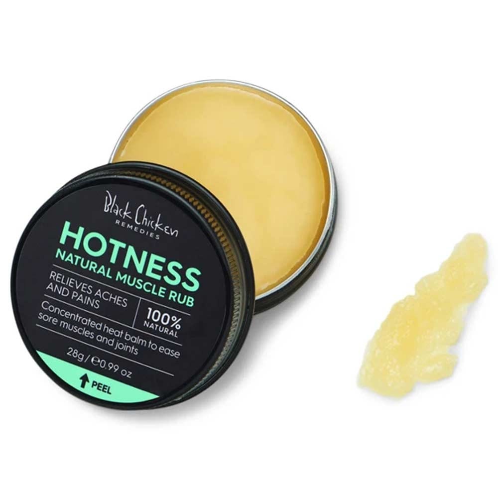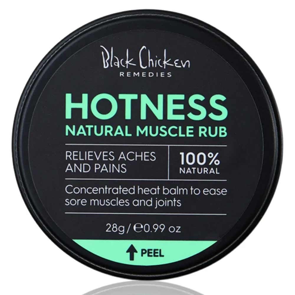 Black Chicken Remedies Hotness Natural Muscle Rub 28g. A naturally derived muscle rub for soothing aches and pains, reducing inflammation and contains no petrochemicals, paraffins, alcohol, or other harmful chemicals. Gives fast-acting, temporary relief for muscle discomfort and works by increasing blood flow to the targeted area. Made in Australia.