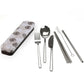 Set includes high quality stainless steel utensils; fork, knife, spoon, chopsticks, straw, straw cleaning brush.