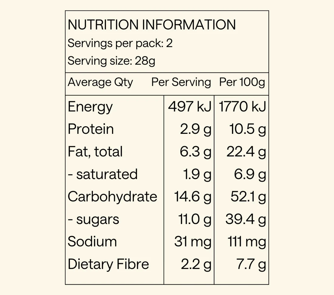 Medjool Dates*, Australian grown Peanuts*, Cacao Paste*, Date Powder*, Cacao Butter*, Tasman Sea Salt. Contains Peanuts. May contain traces of tree nuts. *Organic