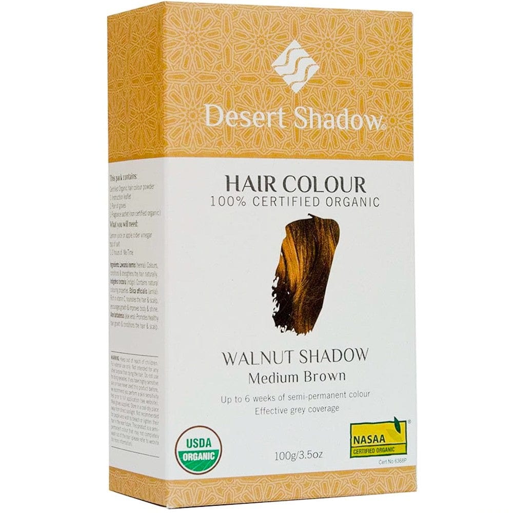 Desert Shadow Organic Hair Colour - Walnut Shadow 100g. Introducing the first 100% Certified Organic hair colour in Australia - made from plant leaves, berries and aloe vera. Provides long lasting conditioning, lustrous colour, grey coverage and radiant shine. Up to 6 weeks of semi to permanent colour.  Kit includes 1 x 100g hair powder, gloves and instructions. Medium natural brown hair colour. 100g.
