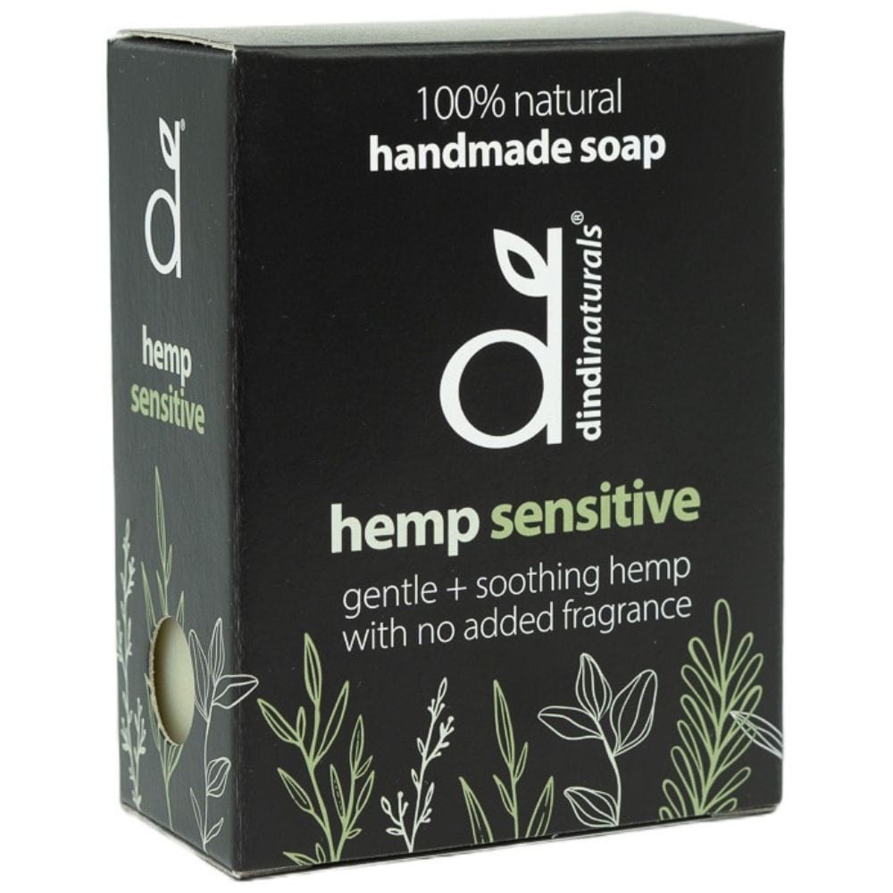 Dindi Naturals Boxed Hemp Soap Bar 110g - Unscented/Sensitive. A 100% natural, sensitive skin soap bar handmade from hemp seed oil with added olive, coconut and rice bran oils. Completely free from palm oil, synthetic colours and fragrances but loaded with shea butter and French green clay for a creamy, gentle and nourishing experience. Vegan friendly. Boxed soap bar.