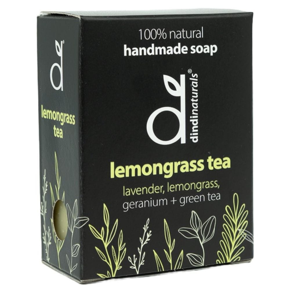 Dindi lemongrass tea palm oil free natural soap 110g. 100% natural palm oil free soap handmade from the finest natural raw ingredients. Completely free from palm oil, synthetic colours and fragrances. 110g packaged bar.