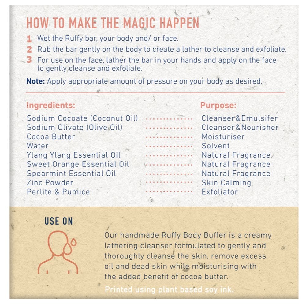 Wet the Ruffy bar, your body and/or face and rub the bar gently on your body to create a cleansing and exfoliating lather. For use on the face, we recommend lathering the bar in your hands first and applying this to the face.