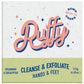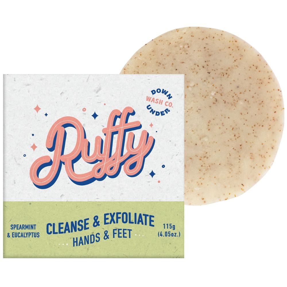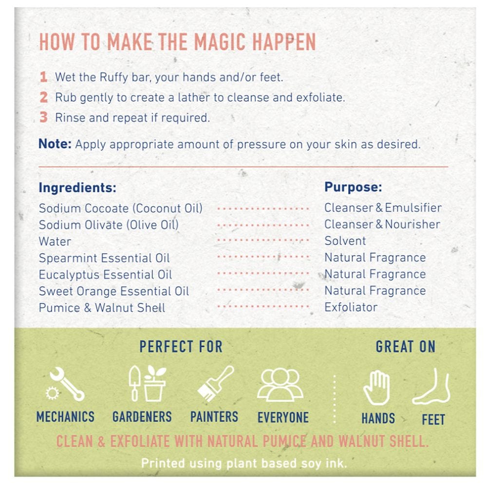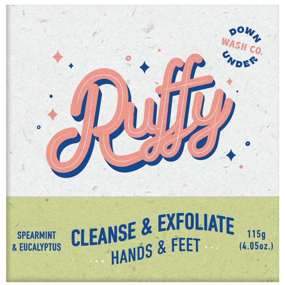 Wet the Ruffy bar on your hands and feet, working into a lather to cleanse and exfoliate. Rinse and repeat if necessary.