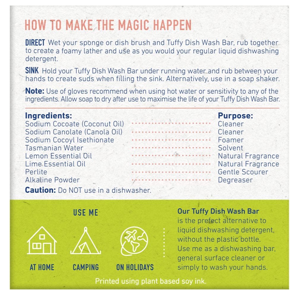 Downunder Wash Co Tuffy Dish Wash Bar - Lemon & Lime. This handmade Tuffy Dish Wash Bar is the perfect alternative to liquid dishwashing detergent, without the plastic bottle. Tuffy Dish Wash Bar is NOT just another dish soap bar! The formulation includes powerful Alkaline Powder to cut through grease and fat and Perlite to act as a gentle scourer. Vegan, Cruelty free, Biodegradable and Australian made.