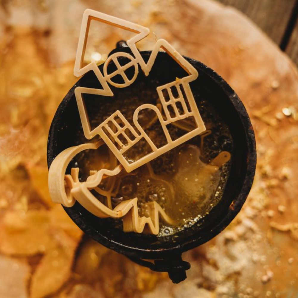 Set of five playdough or cookie dough cutters with a spooky ghost and Halloween theme.