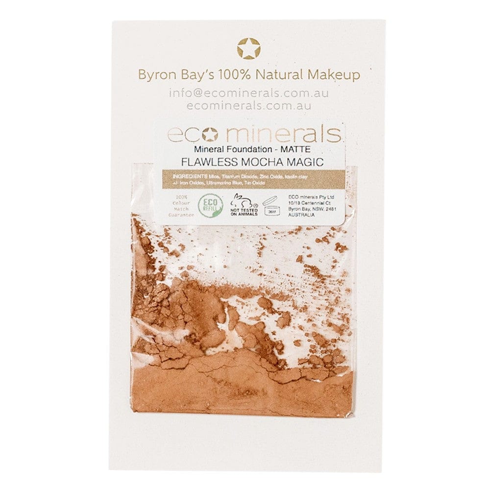 Eco Minerals Foundation REFILL Sachet 5g - Flawless Mocha Magic (Matte). Refill for the 5g jar. This mineral foundation powder provides buildable coverage and a long-wearing matte finish. Suited to the deepest tone skin and suitable for all skin types, especially oily or combination as it helps manage shine. Apply over your moisturiser or face oil for a naturally flawless look that lasts all day and protects your skin with SPF 25.