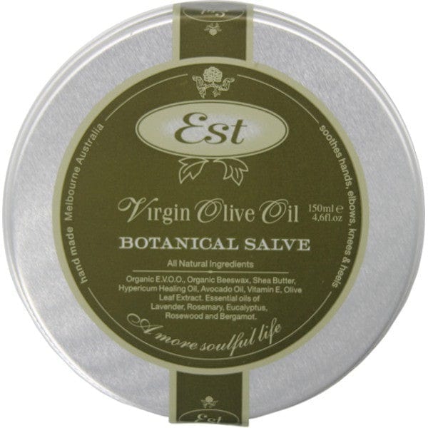 Est botanical salve. Handmade virgin olive oil salve with healing oils and herbs. Divine smelling salve to rescue dry and cracked hands, heels, elbows and knees. 150ml.