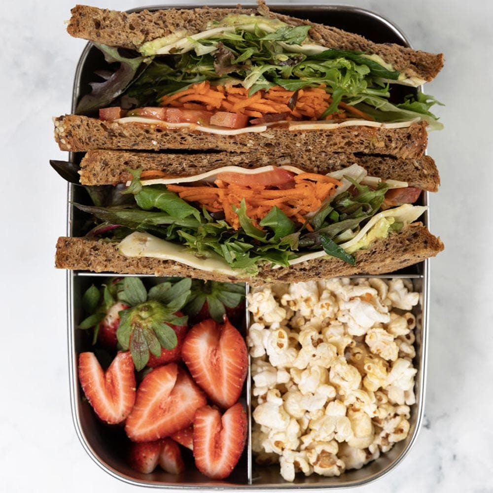 • Has three compartments - one large compartment for the main meal item, and two snack compartments for fruit, crackers, even sushi!