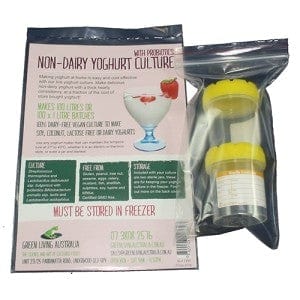 Green Living Yoghurt Culture + 2 Jars - Vegan Non-Dairy. 100% dairy and soy free vegan yoghurt culture specifically grown on a non-dairy and non-soy based medium. Makes 100 litres with soy, coconut, lactose free or nut milks. Contains probiotics.