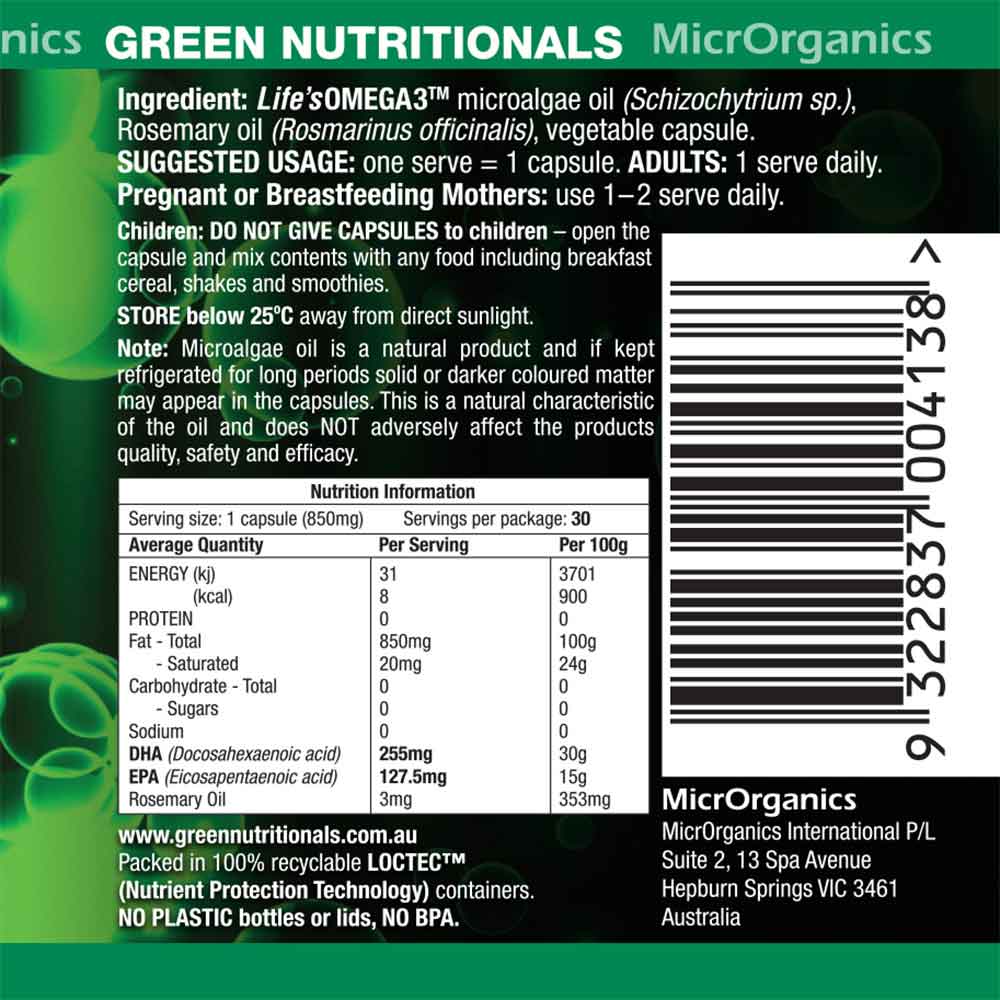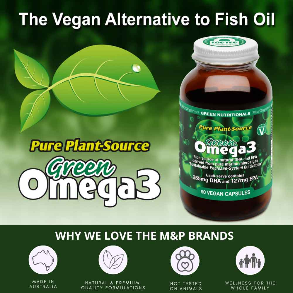 GreenOMEGA 3 has bypassed the fish and gone straight to the source to get these essential Omega 3 fatty acids DHA and EPA from the very same organic marine microalgae (Schizochytrium sp.) the fish get them from.