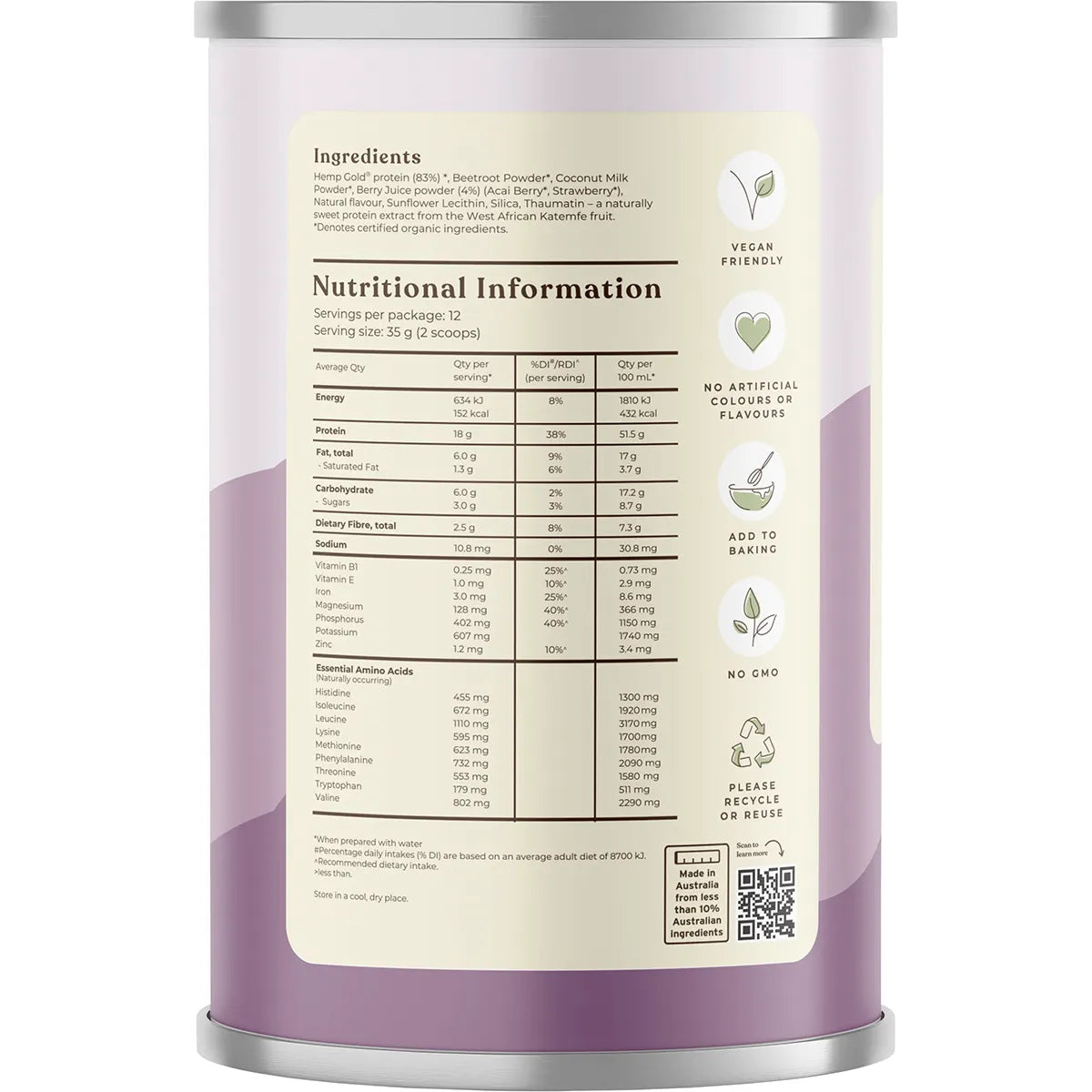 Hemp Gold Protein (83%)*, Beetroot Powder*, Coconut Milk Powder*, Berry Juice Powder (4%)*, (Acai Berry*, Strawberry*) Natural Flavour, Sunflower Lecithin, Silica, Thaumatin - A Naturally Sweet Protein Extract From The West African Katemfe Fruit. *Denotes Certified Organic Ingredients