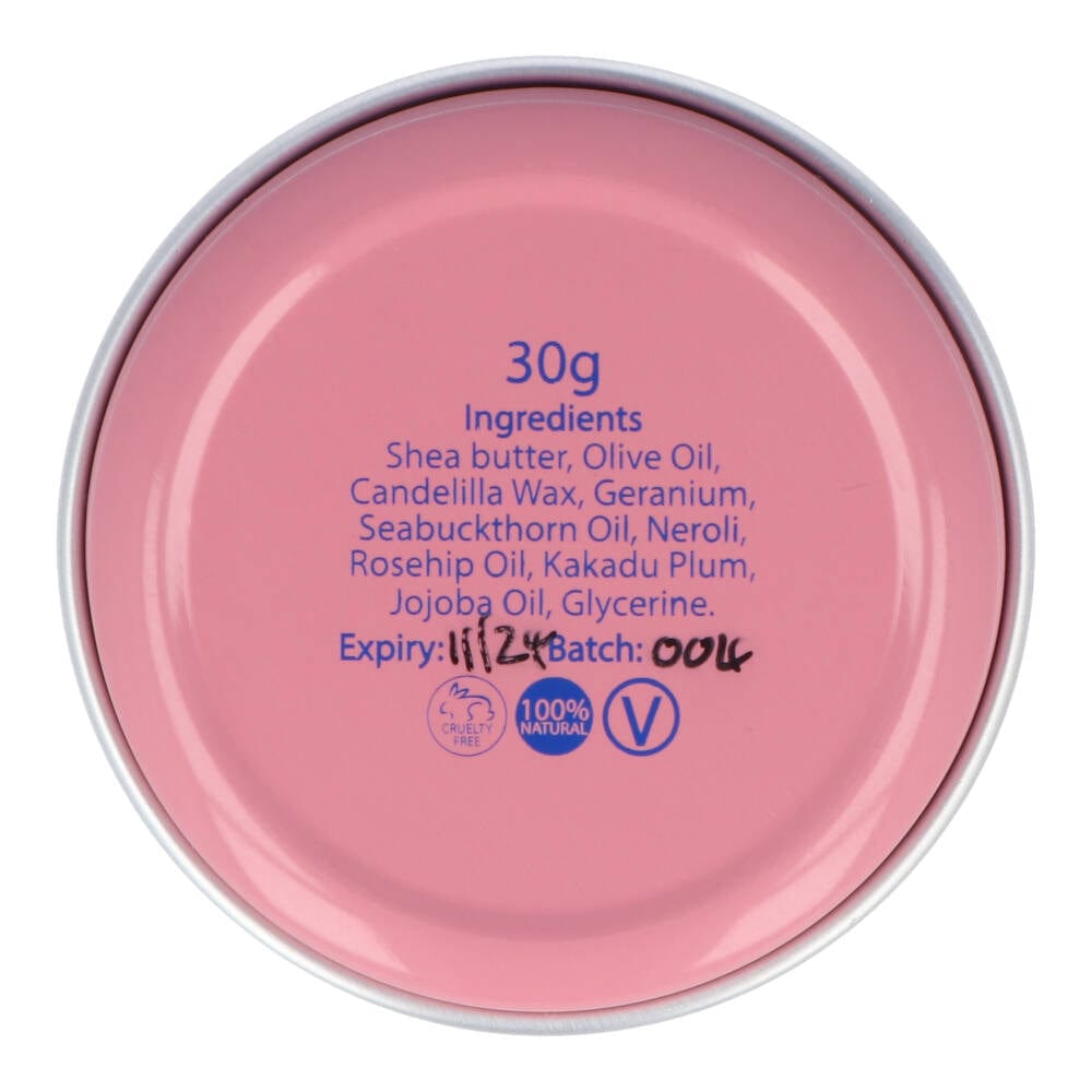 Shea Butter, Olive Oil, Candelilla Wax, Seabuckthorn Oil, Rosehip Oil, Kakadu Plum, Jojoba Oil, Glycerin, Geranium and Neroli Essential Oils.