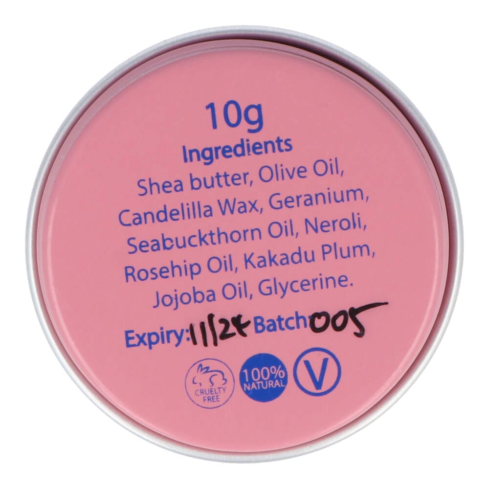 Shea Butter, Olive Oil, Candelilla Wax, Seabuckthorn Oil, Rosehip Oil, Kakadu Plum, Jojoba Oil, Glycerin, Geranium and Neroli Essential Oils.