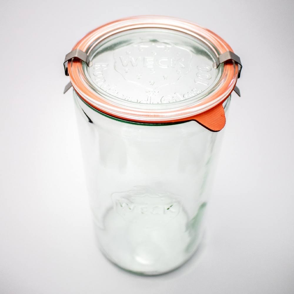 Jar Weck Cylinder 1.5 Litre. This beautiful wide-mouth Weck cylinder jar is perfect for preserving whole veg, or fermenting in large quantities e.g. sauerkraut or kimchi. One and a half litre capacity.