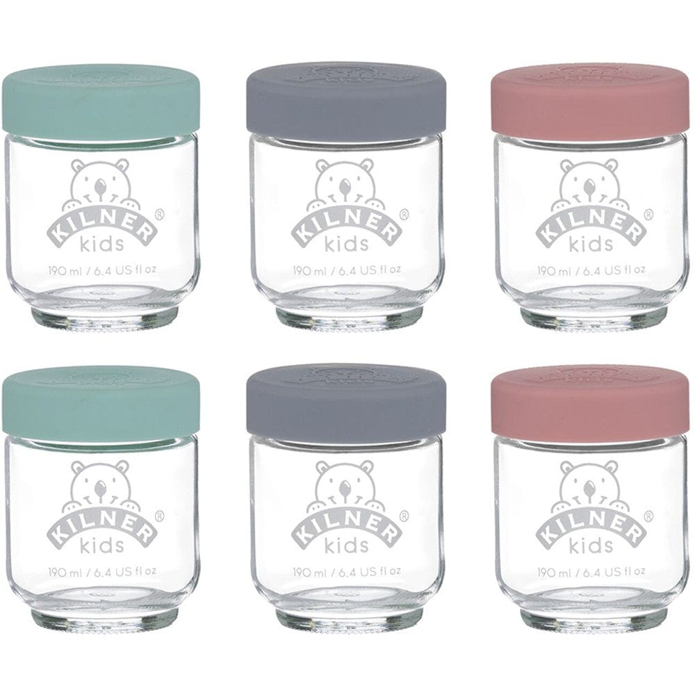 Kilner Kids Jar Set of 6 - 190ml. A set of six cute and convenient glass food storage jars for baby and toddler meals. Featuring non-spill push top silicone lids and a handy 190ml capacity, these jars make food prep and meal time easy. Dishwasher, microwave and freezer safe, they are ideal for homemade purees and batch cooking. 6 x 190ml jars.