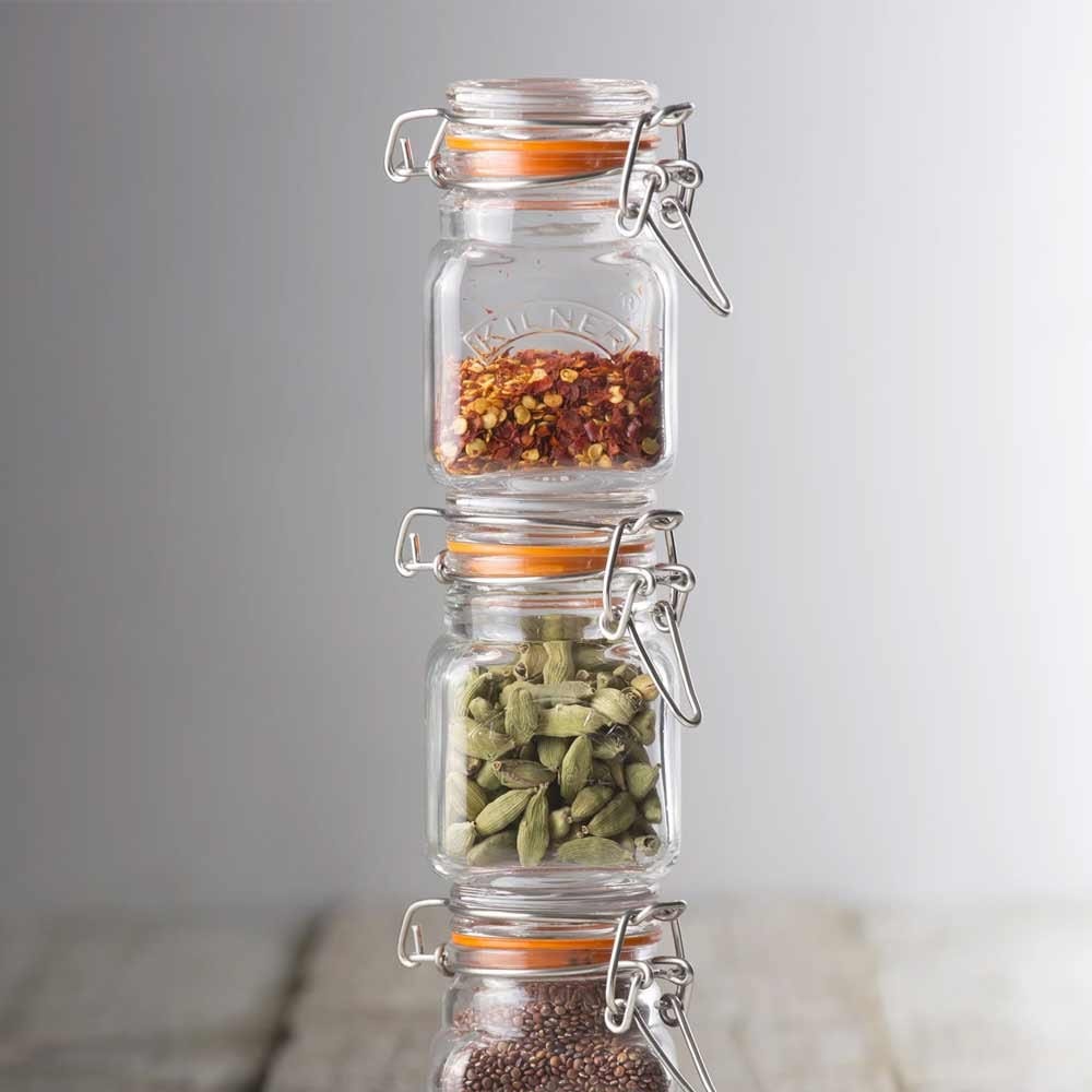Kilner Square Clip Top Jar Set of 12 - 70ml. A set of 12 extra-small, square glass jars ideal for storing herbs and spices. Airtight, versatile and toxin free, these little jars are endlessly reusable and with care should last a lifetime. Invest in a zero waste and plastic free pantry by buying in bulk and storing in reusable containers. Set of 12, 70ml capacity.