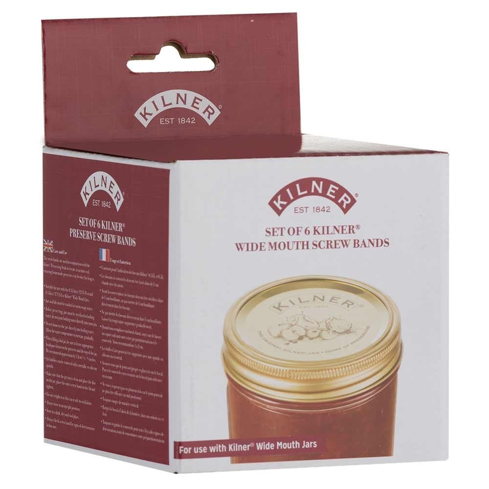 Kilner Wide Mouth Jar Screw Bands - Pack of 6. Set of 6 replacement screw bands suitable for use with 0.35L and 0.5L wide mouth Kilner preserve jars. Give jars with missing lids a second life.