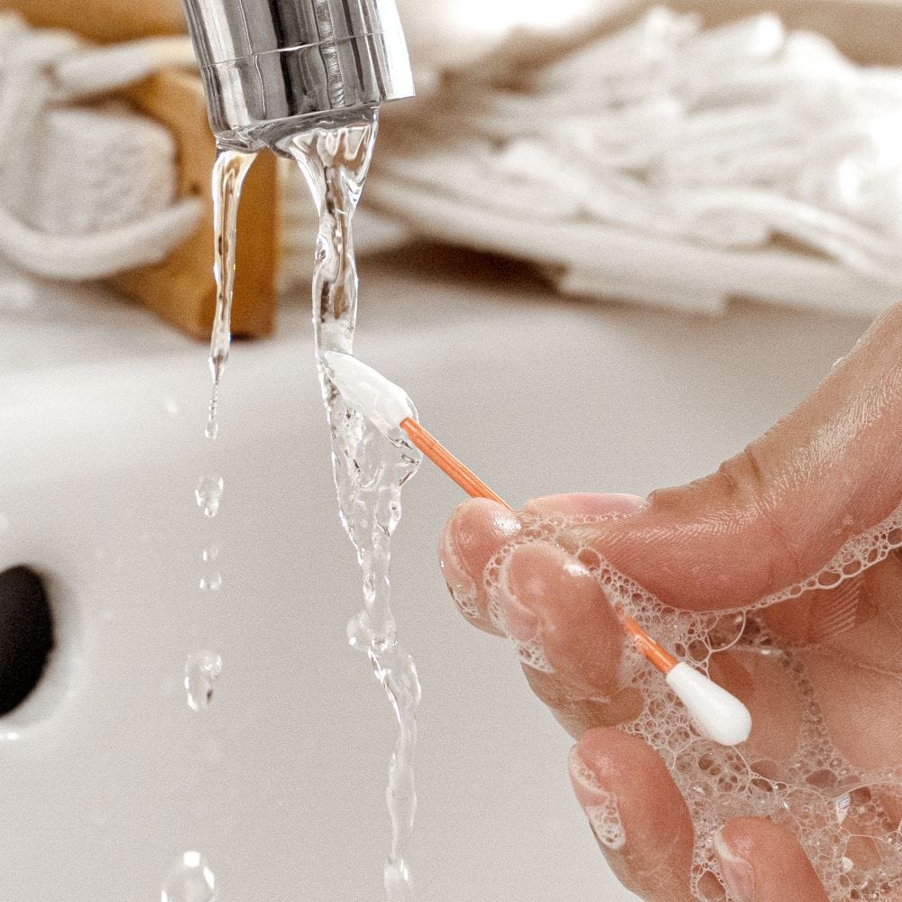 To clean the swab, use a little soap and water and gently rub the tips for 1-2 seconds. Rinse and put it back into the fabulous case, and it’s ready to be used again.