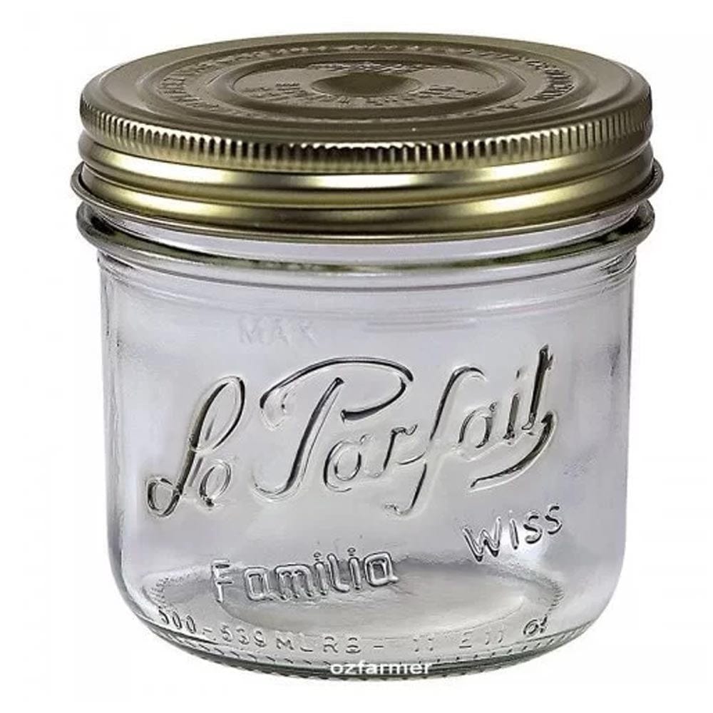 Le Parfait Familia Wiss Preserving Jar 500ml. This mason style jar is made of tempered glass suitable for pressure canners and water baths. The perfect fermenting, pickling and preserving vessel with a wide mouth, sealing cap and a metal lid that screws. 500ml.