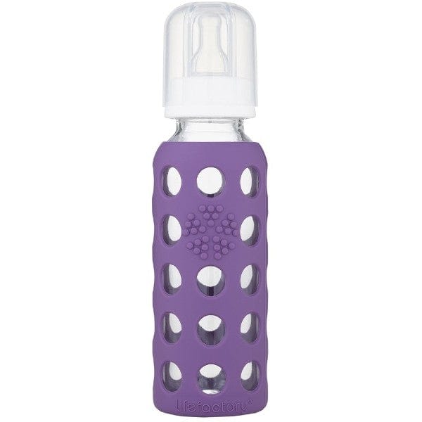 Lifefactory Glass Baby Bottle 265ml - Grape. Lifefactory glass baby bottles are durable and completely free of the harmful chemicals found in many plastic bottles. The bright colored silicone sleeve helps your baby to grip the bottle, while also protecting the bottle from damage. Grape purple silicone sleeve. 265ml.