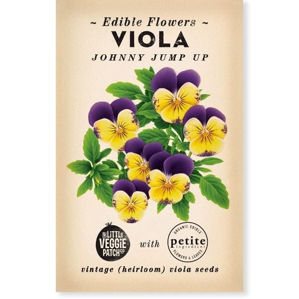 Little Veggie Patch Heirloom Seeds - Viola Johnny Jump Up. Grow your own Violas with these Heirloom Seeds. Violas are edible flowers that encourage pollinators into the veggie patch. Produced in Australia.