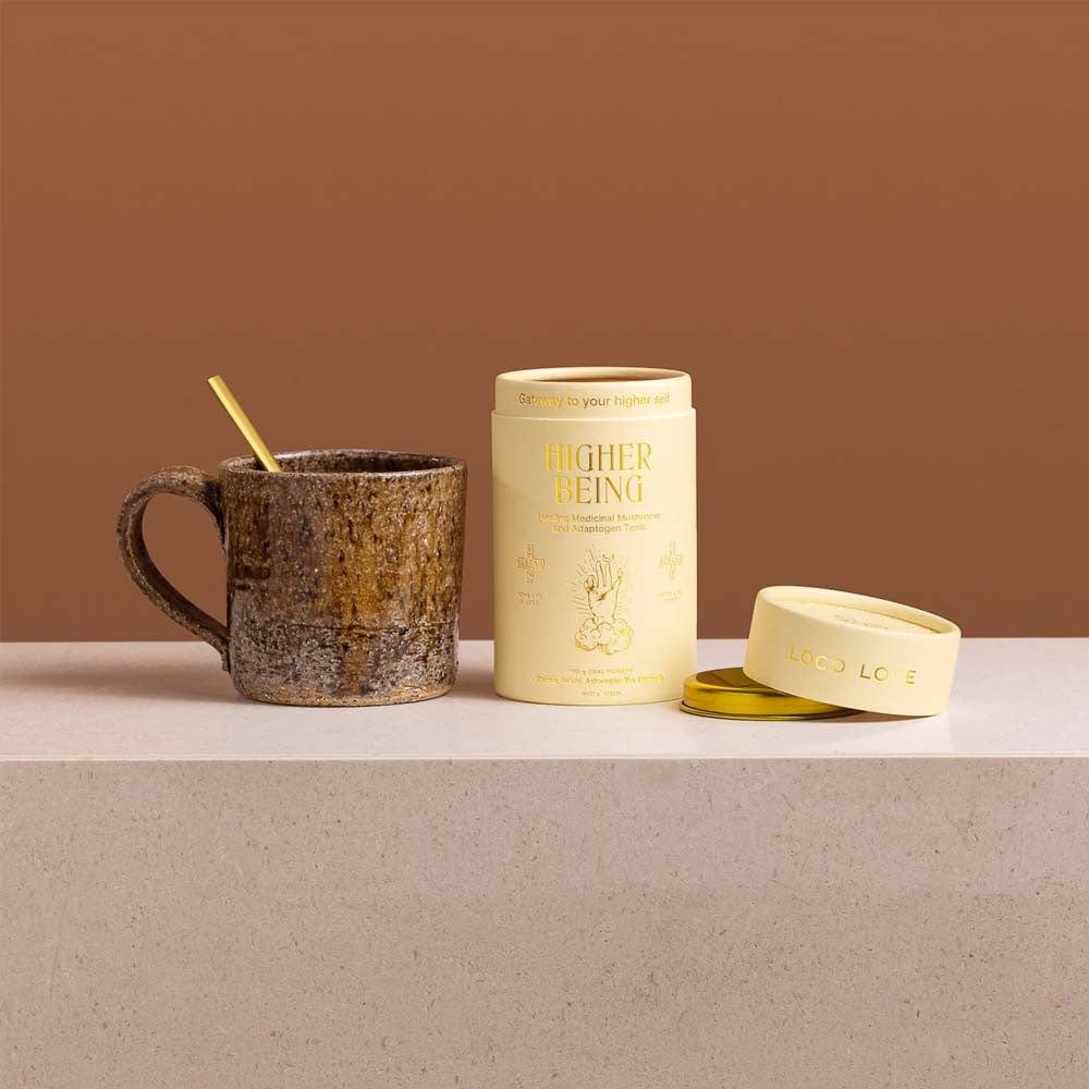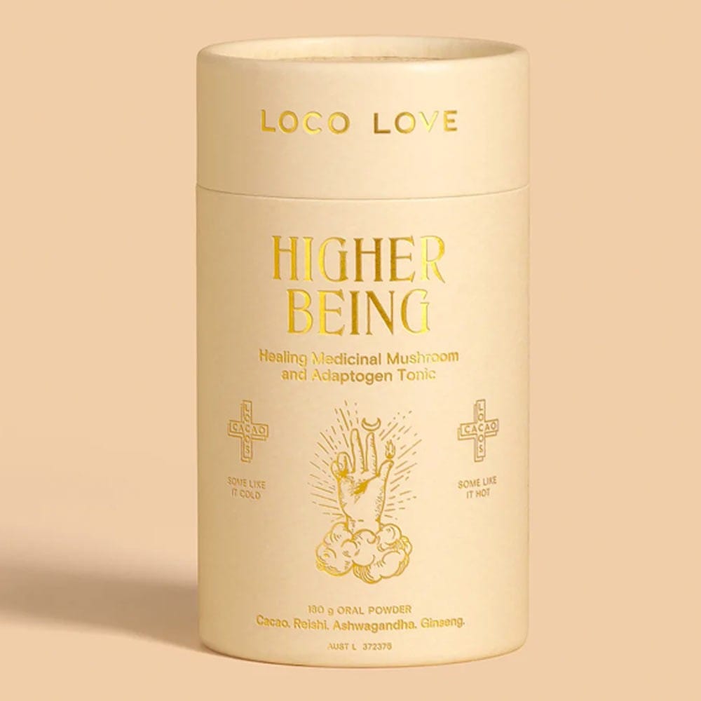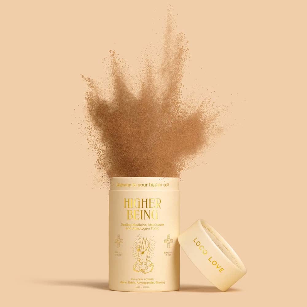 Loco Love's Higher Being healing mushroom powder and adaptogen tonic contains a blend of Traditional Chinese, Ayurvedic and Western medicinal herbs. Packed full of super foods like Reishi mushroom, Ashwagandha and American Ginseng, these medicines will help to relive fatigue, support mental recall and relieve symptoms of indigestion.