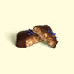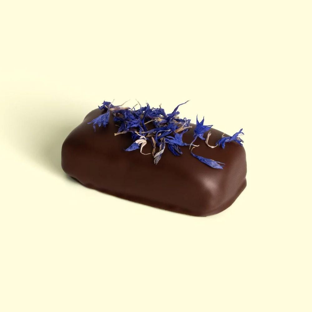 The salty-sweet, chewy-crunch of toasted tamari almonds folded inside gooey almond butter caramel. Wrapped in dark Peruvian cacao, spiked with ashwagandha, then finished with a light garnish of brilliant blue edible cornflowers.