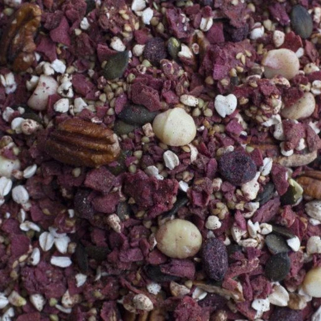 Activated nuts & seeds** (buckwheat* pepitas* pecans*) coconut chips* cacao butter* brown rice malt syrup* golden linseed* cranberries* (sweetened with apple juice*) raw macadamias* puffed buckwheat* beetroot* ginger* cinnamon^ maca* mesquite* pomegranate* red rose petals* vanilla bean* *=Certified organic ingredient; **= Activated in kombucha*, filtered water + Australian rock salt;