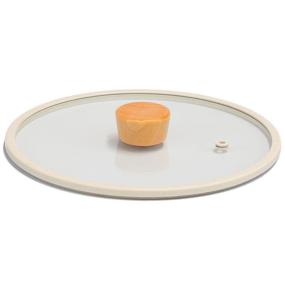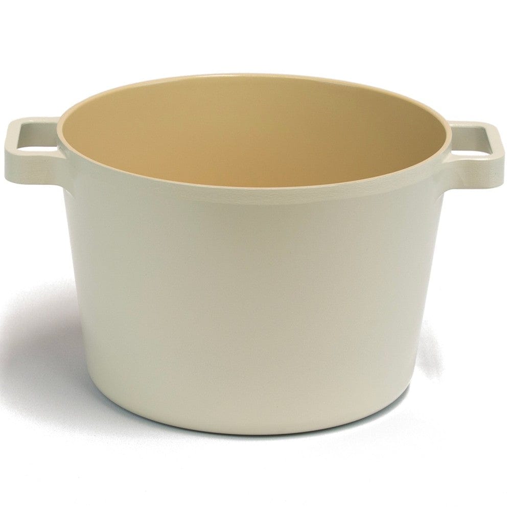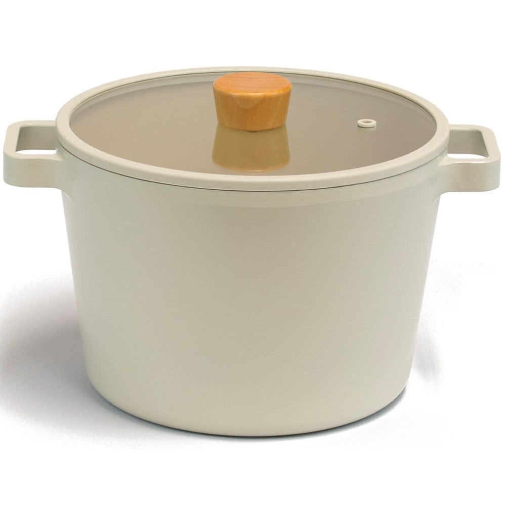 NeoFlam Fika Deep Casserole & Stockpot 22cm. A toxin free non-stick stockpot with glass lid. Featuring a beautiful bone colour ceramic coating and wooden details, this simple Scandinavian inspired pot is 22cm in diameter and a popular size for soups, stock and one pot meals. All Neoflam pans are safe on all cooktops, including induction. 5L capacity.