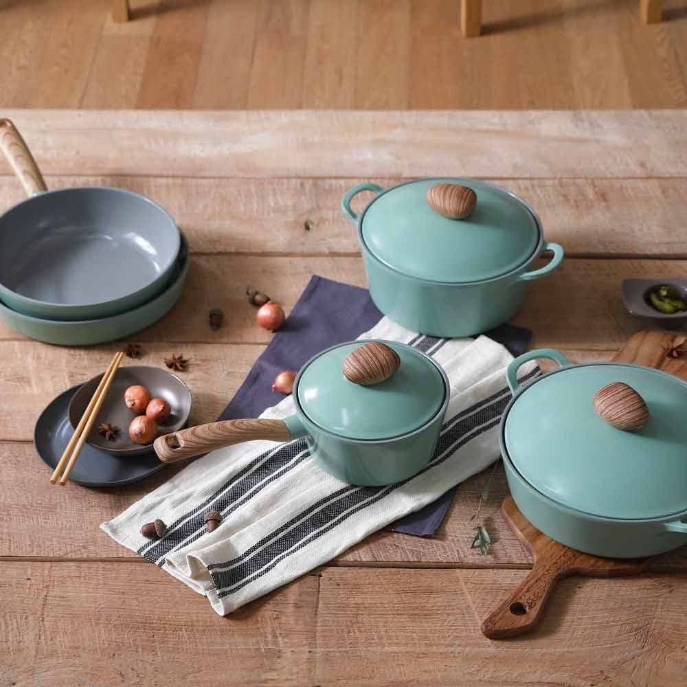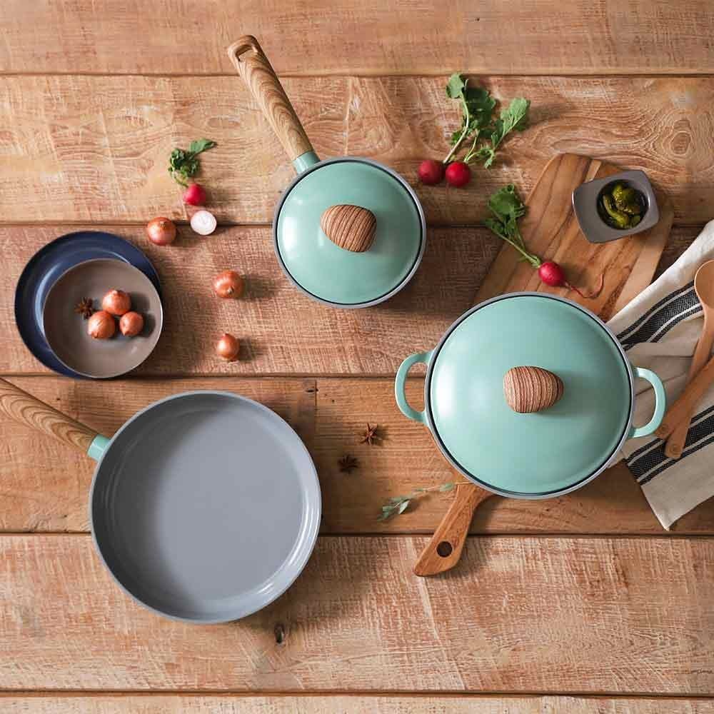 • Unlike most non-stick cookware made with PTFE and other harmful toxins, the ceramic coating is not harmful to the environment or humans because it is made from silica as found in sand and rocks.