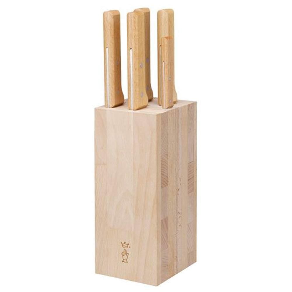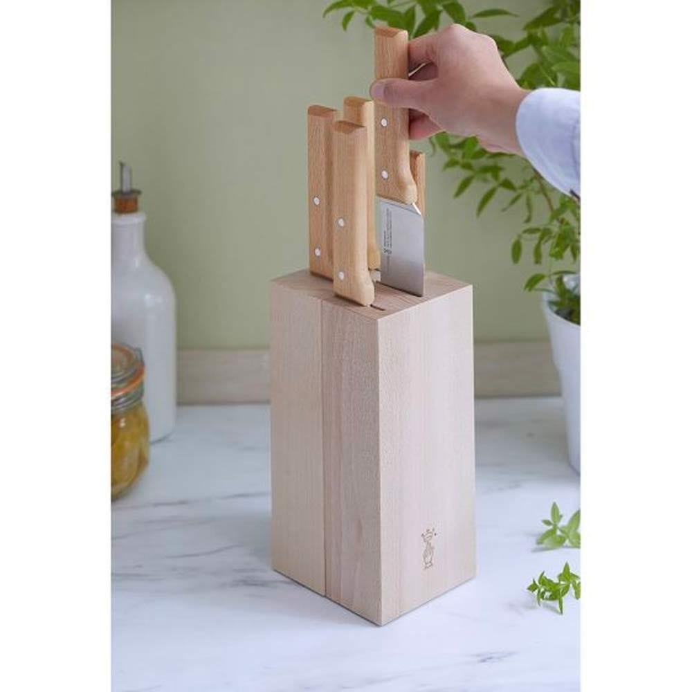 Opinel Parallele Bread Knife Block. A 5-piece knife set and knife storage block for an all-inclusive kitchen setup. This set includes a Paring knife, Chef's knife (20 cm), Santoku knife, Carving knife and Bread knife. Features a beautiful Beech wood block with slots that are cut all the way through to facilitate cleaning, while blades are secure and protected.