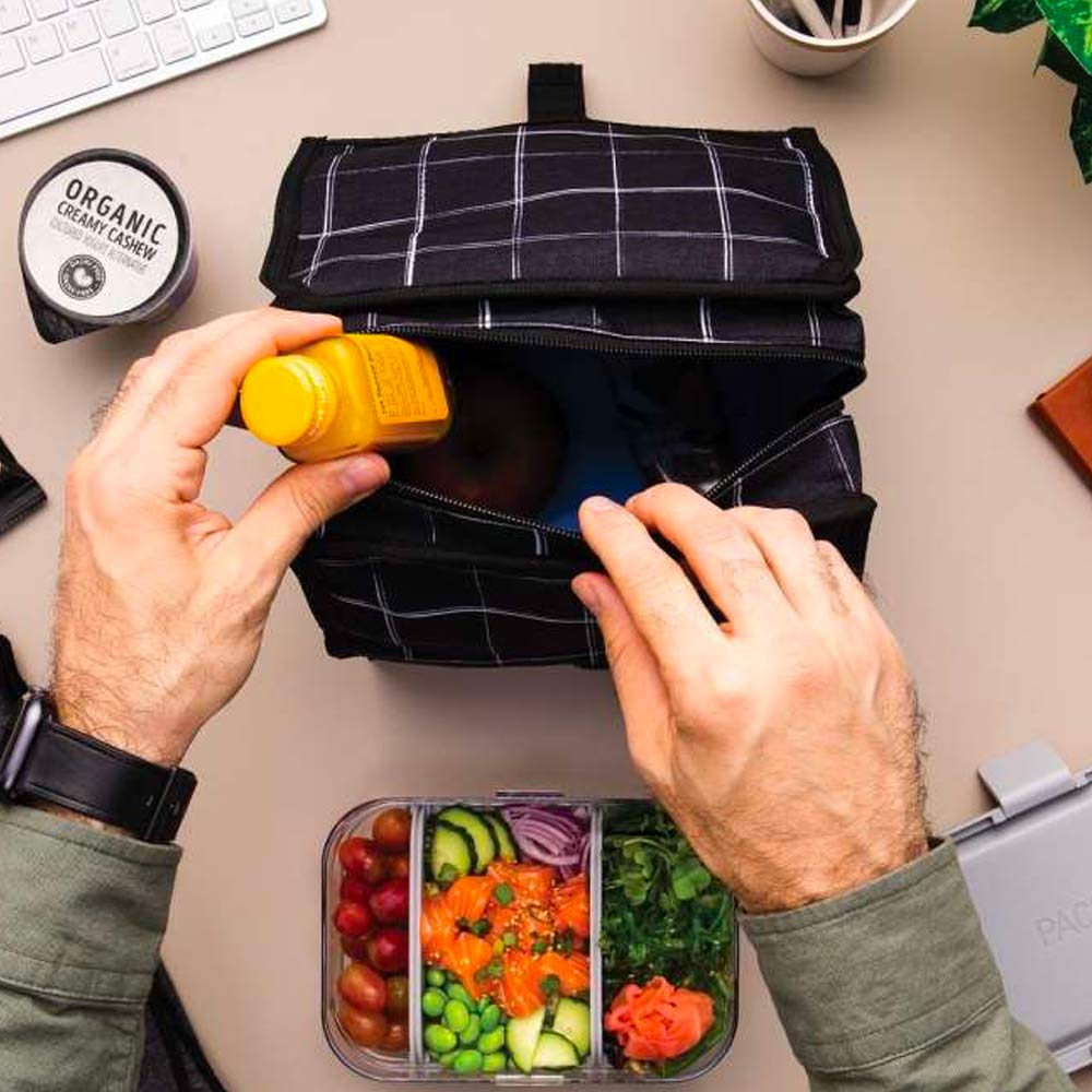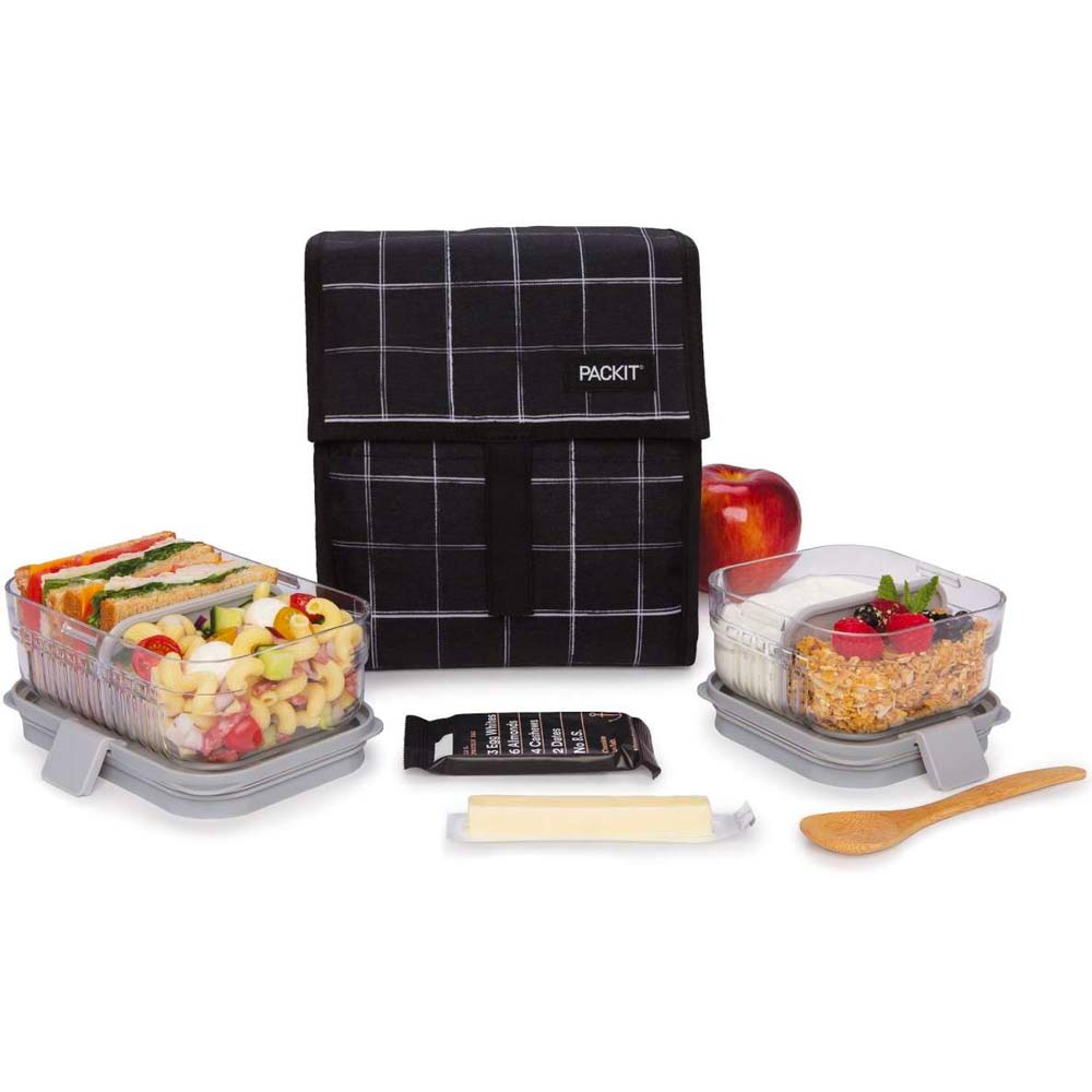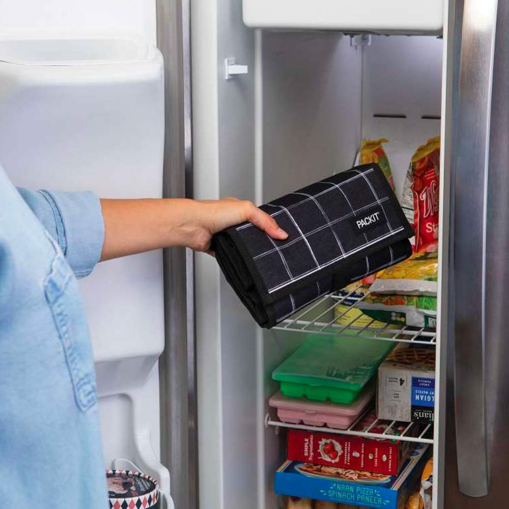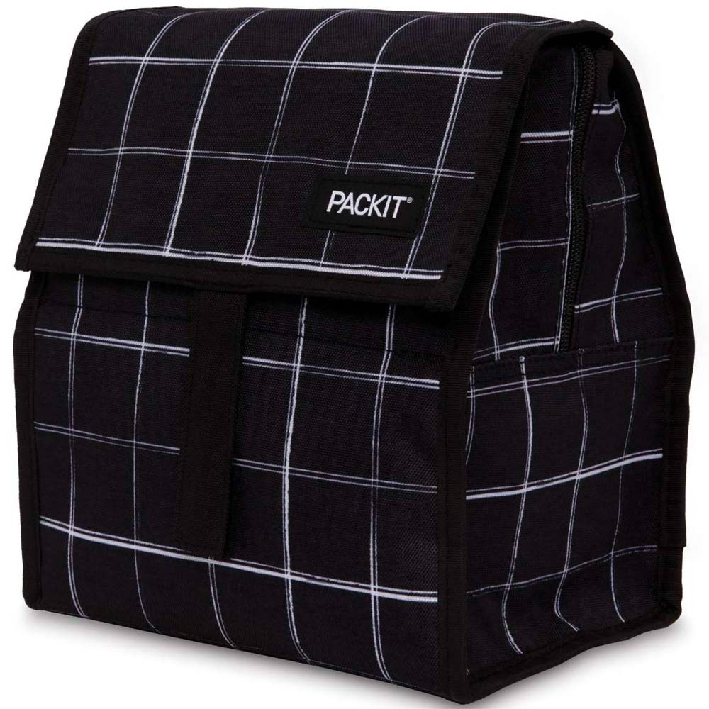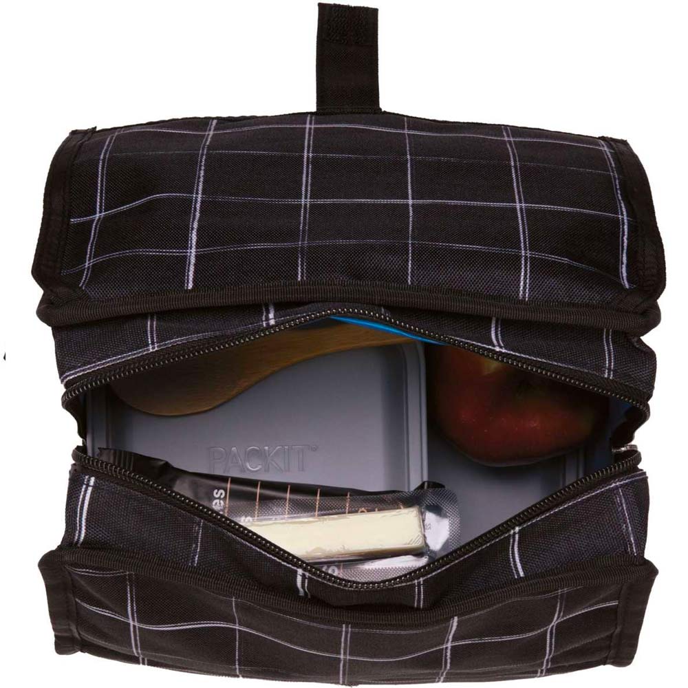 PackIt Freezable Lunch Bag - Grid is the original, bestselling reusable lunch bag made from food-safe, eco-friendly non-toxic materials is roomier in all the right places. Its expanded width and depth easily fits two of their Mod Lunch Bento or Mod Snack Bento containers with plenty of headroom for snacks. A repositioned buckle handle evenly distributes the weight so the front flap always stays in place. The smart design eliminates the need for separate ice packs or gel packs.
