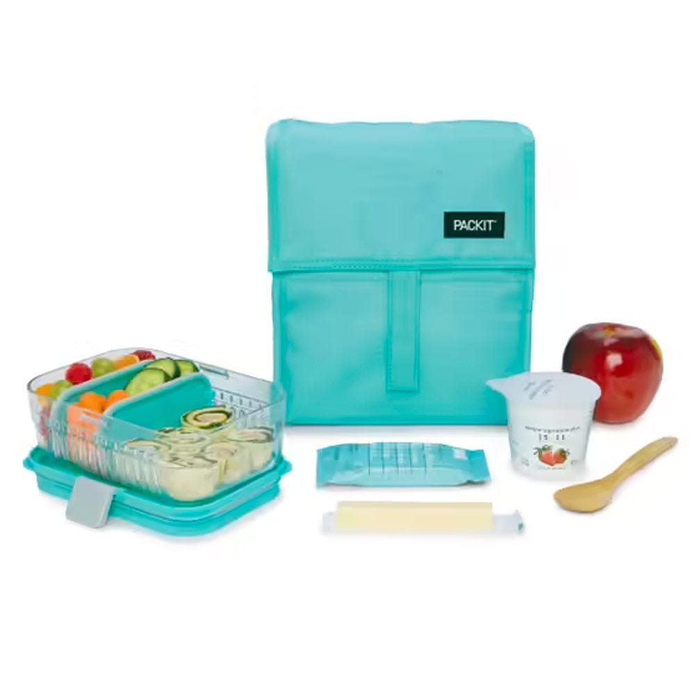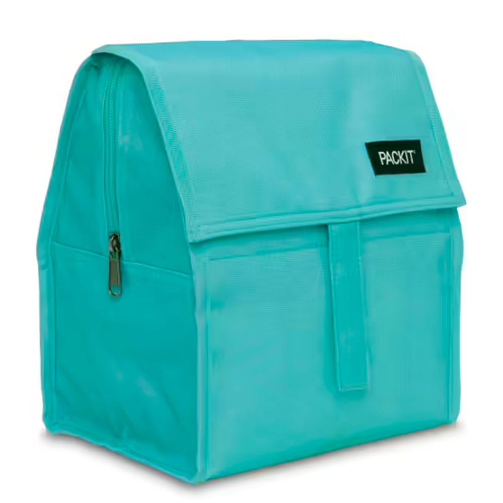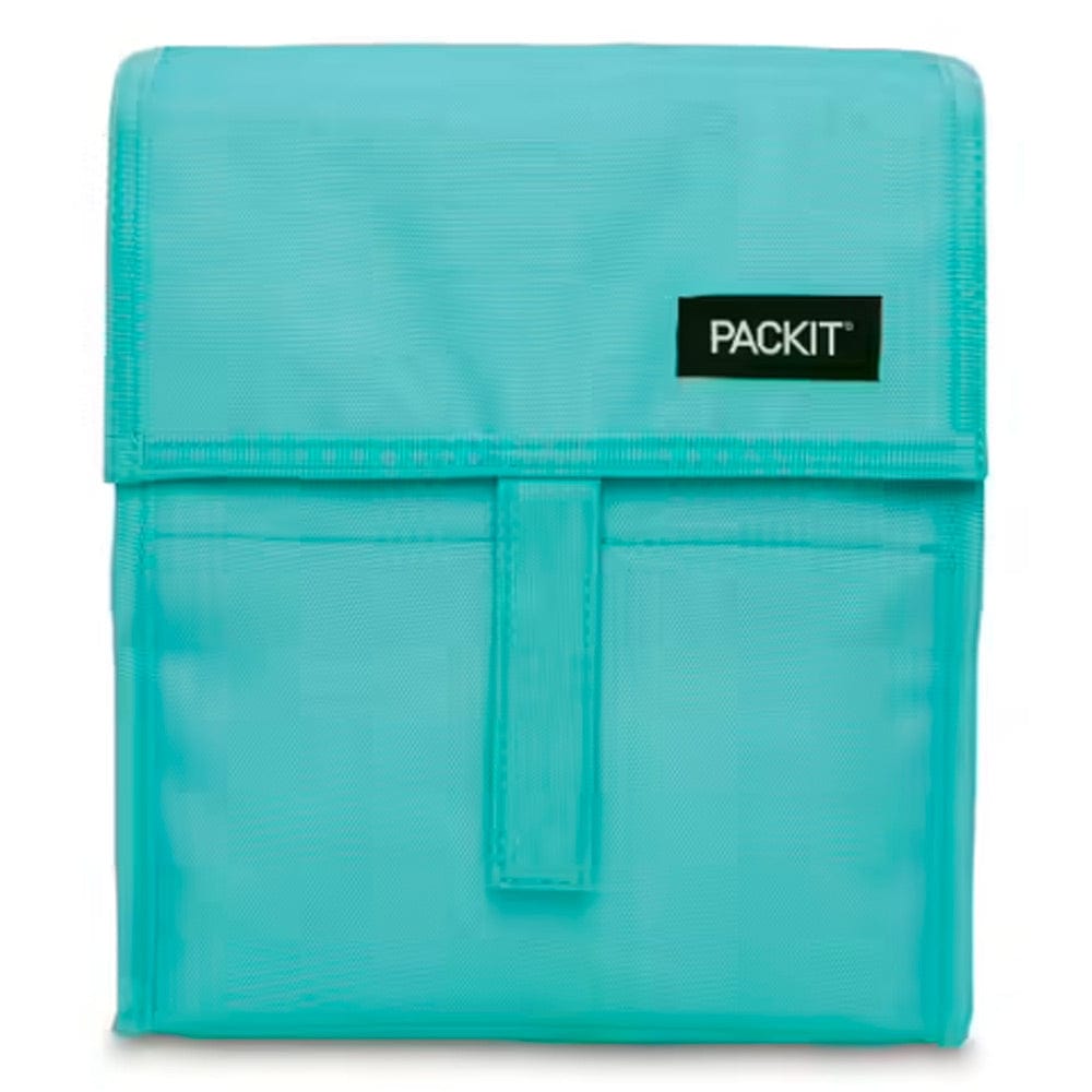 PackIt Freezable Lunch Bag - Mint is the original, bestselling reusable lunch bag made from food-safe, eco-friendly non-toxic materials is roomier in all the right places. Its expanded width and depth easily fits two of their Mod Lunch Bento or Mod Snack Bento containers with plenty of headroom for snacks. A repositioned buckle handle evenly distributes the weight so the front flap always stays in place. The smart design eliminates the need for separate ice packs or gel packs.