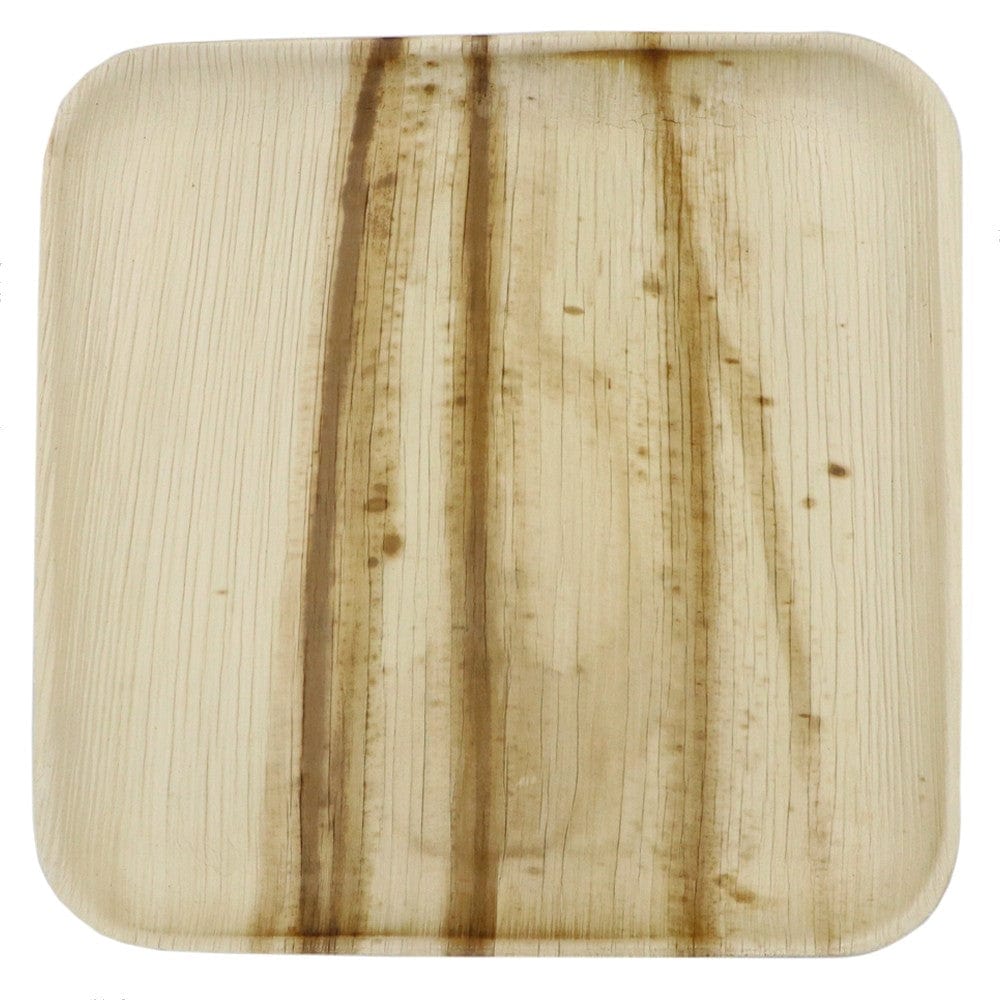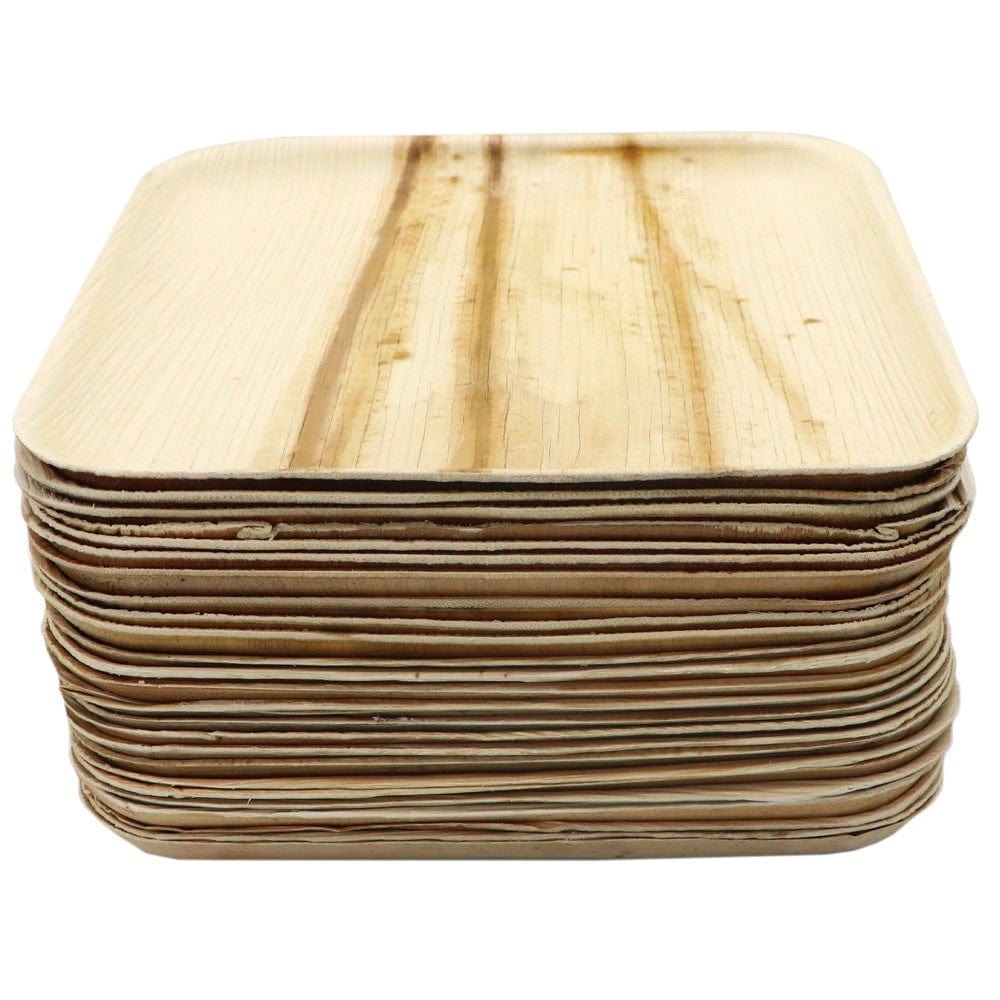 Palm Leaf Dinner Plates 25pk - Square. Stylish, eco solution for easy catering, green weddings, picnics, barbeques and large out door events. Made from naturally shed palm leaves. Return them to the earth when finished. SKAL certified organic.
