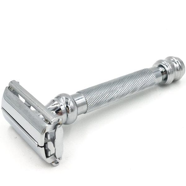 Parker 99R Safety Razor + Blades - Silver. Double edge safety razor with a long textured handle for better grip when shaving in the shower with wet soapy hands. Light to medium weighted head ideal for shaving the body and face. Silver finish. Use the handle for life and replace only the blades. Purchase replacement blades here.