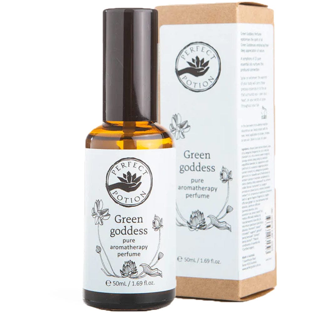 Perfect Potion Green Goddess Perfume 50ml. This pure aromatherapy perfume epitomises the spirit of all Green Goddesses and encourages one to deeply appreciate the true essence of nature. Vegan, sustainably sourced and cruelty free. Australian made and owned.