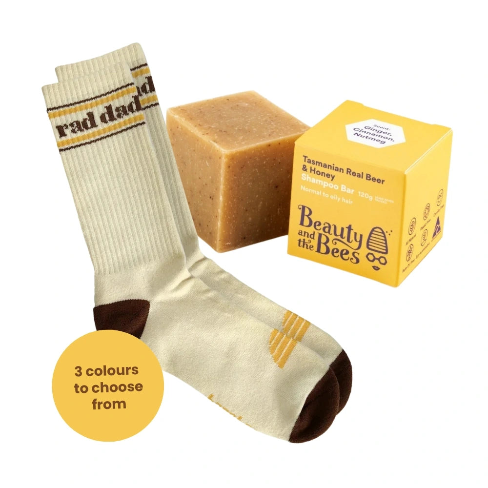 From head to toes, he's good to go! Treat him to these Rad Dad organic cotton socks and a splash of Real Beer Shampoo. He’ll step out looking fresh and feeling fine.