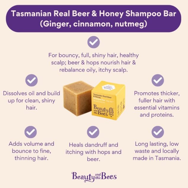 Filled with locally brewed craft beer, Tasmanian Leatherwood honey and warming spices for strong, shiny hair that bounces with health. Dissolves oil and buildup for clean, shiny hair. Promotes thicker, fuller hair with essential vitamins and proteins. Heals dandruff and itching with hops and beer. Adds volume and bounce to fine, thinning hair.