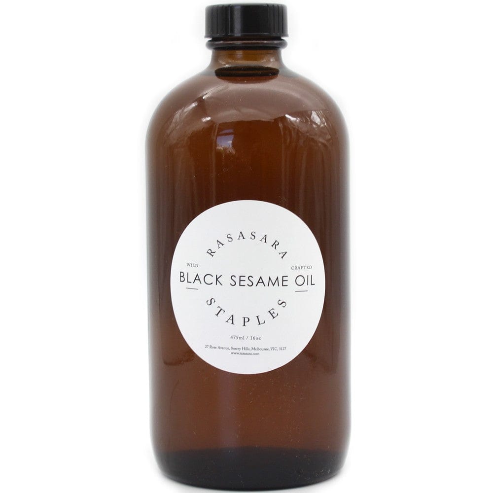 Rasasara Skinfood Wild Crafted Black Sesame Oil 475ml. A staple in Ayurvedic tradition, this 100% wild crafted black sesame oil is best used as a body moisturiser, offering warming and detoxifying effects, while it's rich in fatty acids. Soothing and reducing the prevalence of Vata, without aggravating Kapha, it is known to promote stability, strength & softness. Packaged in a large reusable amber glass medicine bottle.
